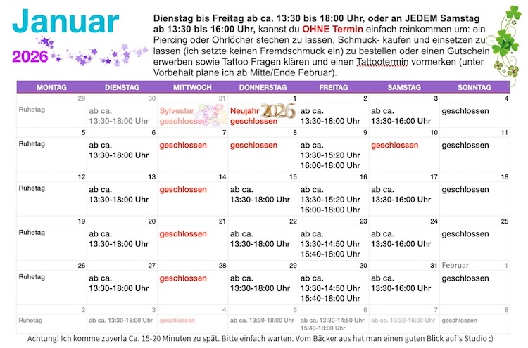 - Dienstag und Freitag ab ca. 13:30 bis 18:00 Uhr, oder an JEDEM Samstag im Monat ab 13:30 bis 16:00 Uhr OHNE Termin, kannst du einfach reinkommen um: ein Piercing oder Ohrlöcher stechen zu lassen, Schmuck- kaufen und einsetzen zu lassen (ich setzte keinen Fremdschmuck ein) zu bestellen oder einen Gutschein erwerben sowie Tattoo Fragen klären oder dich für einen Tattootermin vormerken lassen.